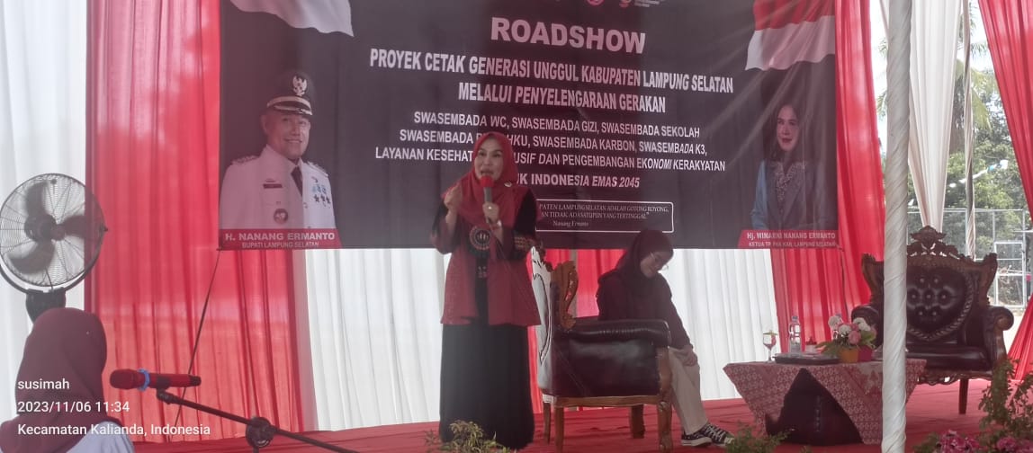 LAMPUNG SELATAN | INFOKUS.WEB.ID – Duta Swasembada Gizi Lampung Selatan Hj. Winarni Nanang Ermanto menjadi pemateri dalam Roadshow Proyek Cetak Generasi Unggul Lampung Selatan, yang berlangsung di Kecamatan Way Sulan Desa Banjar Sari, Senin (06/11/2023).