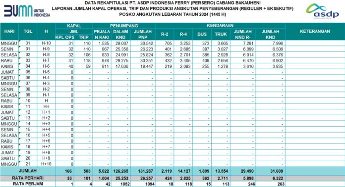 Corporate Secretary PT ASDP Indonesia Ferry (Persero) Shelvy Arifin mengatakan berdasarkan pantauan data posko Merak per 24 jam (periode 4 April 2024 pukul 08.00 WIB hingga 5 April 2024 pukul 08.00 WIB) atau H-7, tercatat 2.435 kendaraan roda dua dan 1.211 kendaraan logistik telah diseberangkan menuju Bakauheni. Secara total realisasi produksi mencapai 3.646 unit kendaraan.