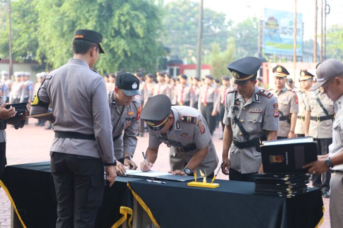 Kapolres Karawang AKBP Wirdhanto Hadicaksono dalam arahannya, Kami melaksanakan total ada 20 jabatan dari mulai pejabat utama dan Kapolsek jajaran tetap jumlah perwira yang mutasi keluar dari polres Karawang