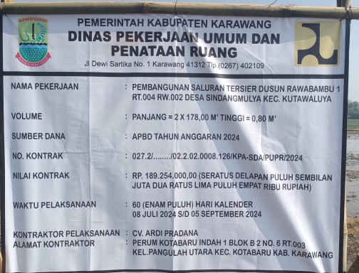 Di ketahui pekerjaan turap jalan di dusun Rawabambu 1 Rt.004/002 Desa Sindang Mulya di biayai dari dinas PUPR dengan nilai kontrak Rp.189.254.000 dengan Panjang 2x178m, Tinggi 0,80m’ Pelaksana /kontraktor CV.ARDI PRADANA engan tanpa unsur di sengaja untuk mengurangi lebar pondasi demi meraup keuntungan pribadi.