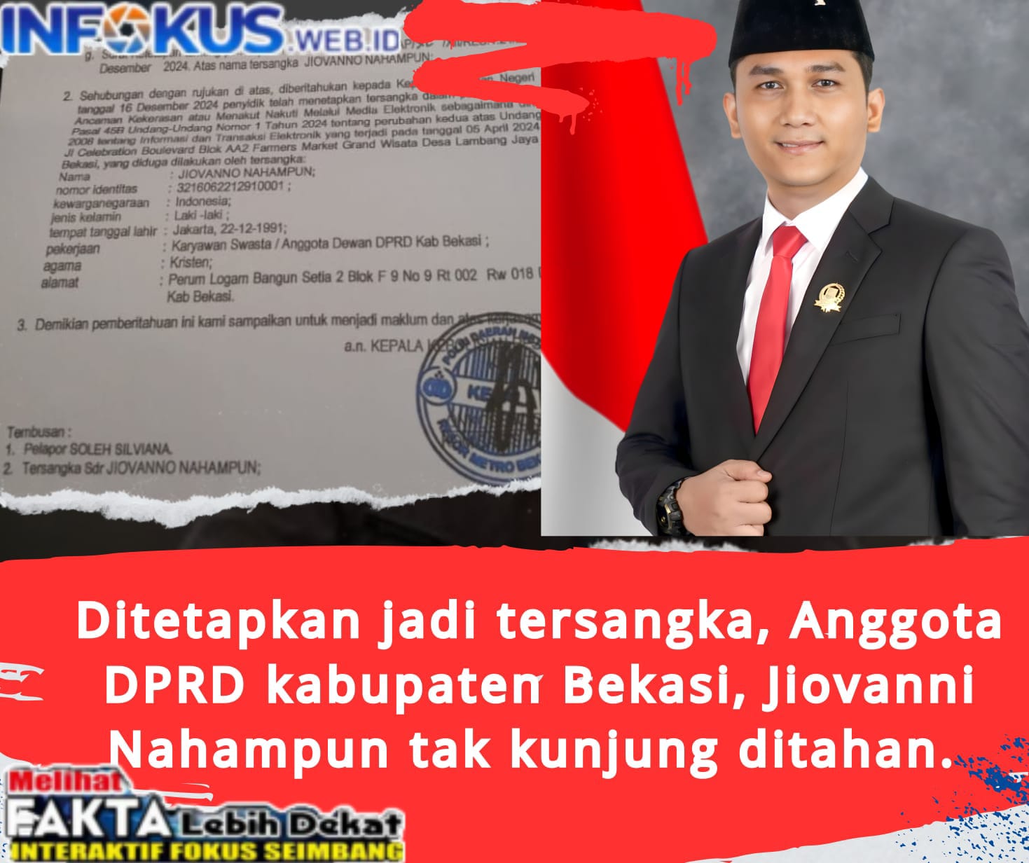 KABUPATEN BEKASI || Infokus.web.id || Jiovani Nahampun (JN) seorang anggota DPRD kabupaten Bekasi dari Partai PDIP nampaknya kini tak bisa tidur nyenyak, pria 34 tahun itu kini ditetapkan menjadi tersangka melalui surat nomor S.Tap/312/XII/1.24/2024/Retro Bekasi pada tanggal 16 Desember 2024 atas dugaan ancaman kekerasan sebagaimana dimaksud pasal 29 jo 45B UU no.1 tahun 2024 tentang perubahan kedua UU no. 11 tahun 2008.