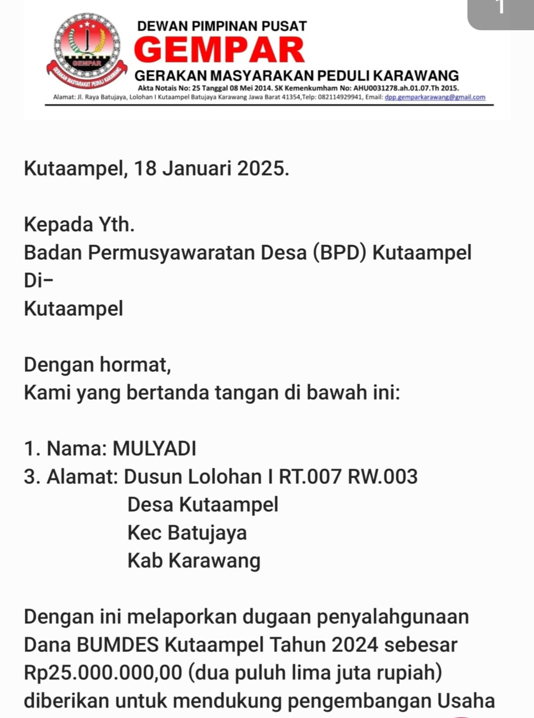 KARAWANG || Infokus.webmid || Dewan Pimpinan Pusat Gerakan Masyarakat Peduli Karawang (GEMPAR) melaporkan dugaan penyalahgunaan Dana BUMDES Kutaampel Tahun 2024 sebesar Rp25.000.000,00 kepada Badan Permusyawaratan Desa (BPD) Kutaampel.